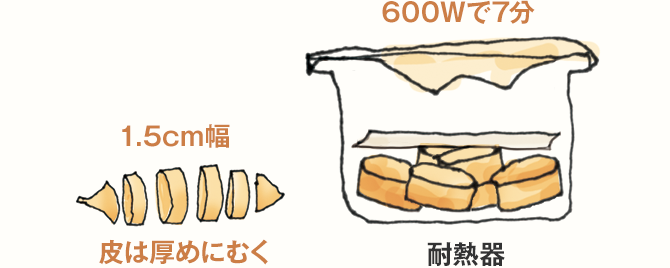 さつまいもは皮をむき、水をたっぷり含ませたキッチンペーパー、ラップをかけて電子レンジで加熱。