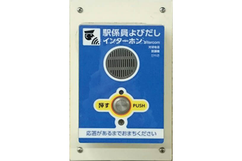 各駅には、駅係員と会話ができるインターホンを複数箇所設置しています。体調の優れないお客さまを見かけた場合や、線路にイヤホンなどの小さな物を落とした場合などは、このボタンを押して係員に連絡してください。