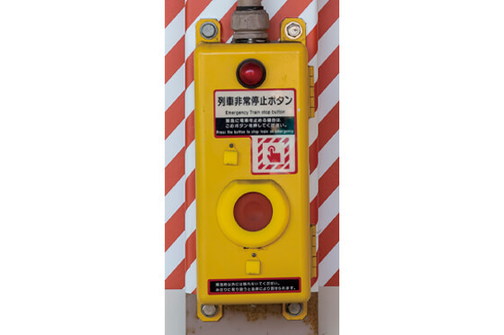 各駅ホームには、付近を走行する全ての列車を緊急停止させるボタンを約40メートル間隔で設置しています。お客さまが線路に転落したほか、運行に支障をきたす物を発見したなど線路内に危険や異常を発見した場合は、このボタンを押して列車を停止させてください。