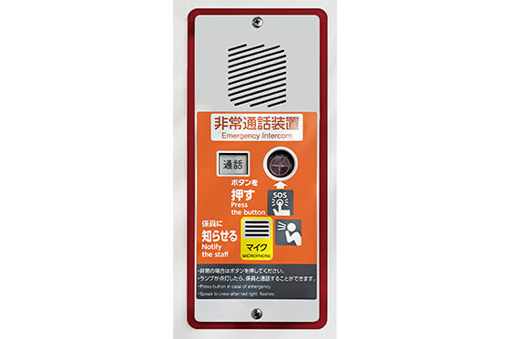 連結部分や車いすスペース付近などに、緊急時に乗務員と直接会話ができるボタンを設置しています(一部車両を除く)。車内で不審者や不審物を見かけた場合や急病人が発生した場合などは、このボタンを押して乗務員にお知らせください。