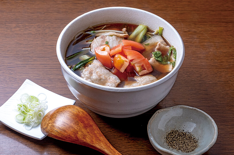 質朴な店構えに「勘」の文字が染められた日よけのれんがお出迎え。そば粉8.5割という絶妙な配合を生かした、店主こだわりの手打ちそばがいただけます。豚野菜あんかけは、青菜と豚バラ肉がたっぷりで、トマトの酸味がアクセント。和食の板前経験から創意工夫が得意だという店主のオリジナルメニューです。別添えの黒こしょうをかけるとより深い味わいに。また、福井・越前産のそば粉を使用予定の新そばは、シンプルにせいろで味わうのもおすすめです。