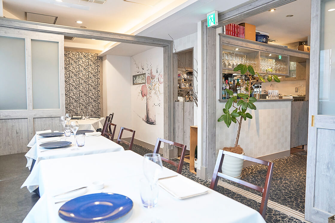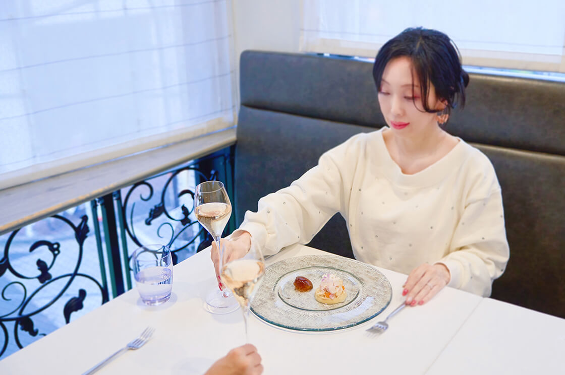 店内はこぢんまりとして落ち着きがあり、清潔感のある白が映えるテーブル空間。窓から柔らかな自然光が差し込み、シンプルなインテリアが、運ばれてくる料理の色彩を引き立てます。席に着いてまず目に入るのは、手書きのメッセージカードです。さりげない一枚が、そっと非日常へといざなってくれます。着席の瞬間から始まるおもてなしも、記念日をより特別なものにしてくれるはずです。繊細なフレンチとともに、大切な人と忘れられないひとときを過ごしてみては。