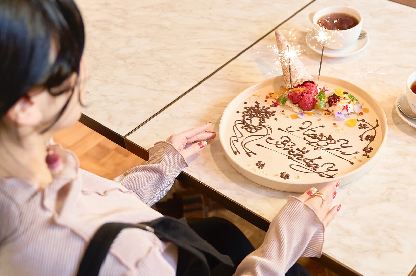 デザートプレートは、描かれたメッセージと華やかな花火の演出で、運ばれてきた瞬間に気分が一気に上がります。内容は時期によって変わりますが、ワッフルコーンを添えたカシスのシャーベットやパンナコッタといった趣向を凝らした一皿が登場します。店内で焼き上げるサクサクのワッフルコーンなど、細部まで丁寧に仕上げるシェフのこだわりが感じられます。