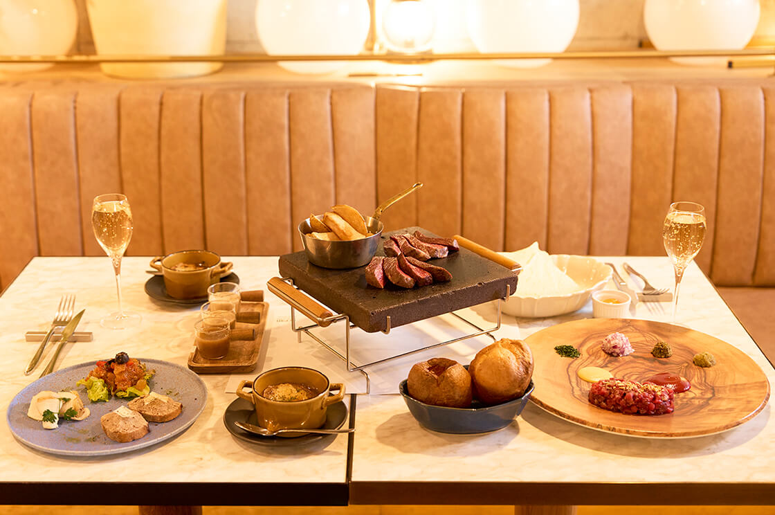 コースは、サクサク食感が印象的な自家製ポップオーバーに、旬の食材を使った前菜3種の盛り合わせ、馬肉のタルタルステーキ、トラディショナルオニオンスープ、ステックフリット赤身肉(ステーキ&フライドポテト)、デザートプレートまで揃った盛りだくさんのラインアップ。