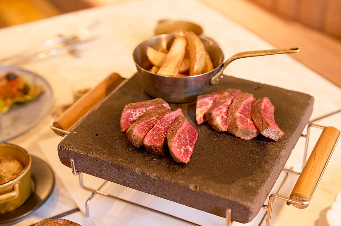 ステックフリットは、ニュージーランド産ロースをブルーレアで提供。約300度のホットストーンで、自分好みの焼き加減に調整できるのも魅力です。プレミアムランクのヒレ肉(+1,000円)や赤城和牛ランプ肉(+2,000円)にグレードアップもできます。ブルーチーズ、ペッパー、オニオンの3種類のソースは、お肉本来の味を生かす軽めの味わいで、食べ進めながら変化をつけられます。