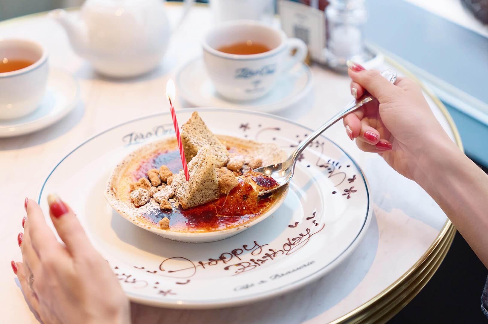 パリのカフェ文化を感じさせるメニューの中でも、記念日シーンにぴったりなのが「お祝いプレート」(1,628円)。クラシックなフレンチスタイルのクリームブリュレにアールグレイのパウンドケーキを乗せたデザートに、オリジナルメッセージとロウソクを添えて提供してくれます。ブリュレは本場フランスの味わいに近づけるため、濃厚なカスタードクリームの表面を厚めにキャラメリゼし、バリッとした食感が楽しめます。下のカスタードは、生クリームとミルクのバランスが良い、とろりとなめらかな口当たり。香ばしいキャラメルとのコントラストが楽しめる一品です。デザートプレートに合わせるなら、やさしい風味の「有機和紅茶」(748円)を。クリームブリュレの濃厚な甘さとよく合います。お祝いプレートは予約しておくと安心で、記念日だけでなく日頃の感謝の気持ちを伝えるなどといった使い方をするのも素敵です。