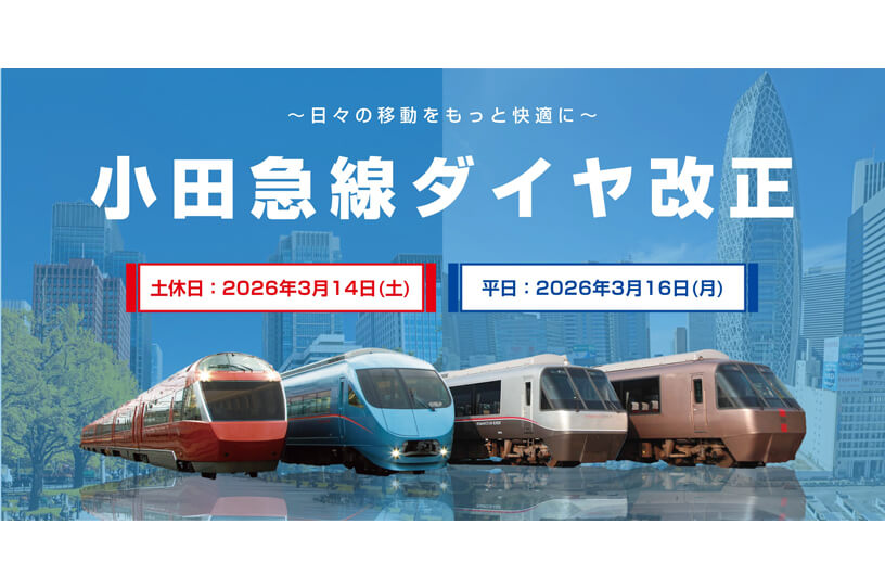 今回のダイヤ改正では、特急ロマンスカーの増発や長編成化、接続改善により利便性を向上させます。また、土休日に新宿を9時に出発する「スーパーはこね号」では、新宿から小田原までの所要時間59分運転※を約2年ぶりに復活させます。詳しくは小田急電鉄ホームページ内のダイヤ改正特設ページをご覧ください。