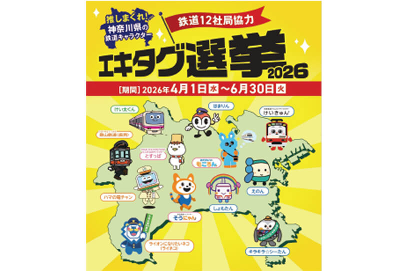 小田急をはじめ鉄道会社12社局が参加する「推しまくれ!神奈川県の鉄道キャラクターエキタグ選挙2026」に「おだきゅうのもころん」が参加します。このイベントは12社局のキャラクターを4エリアに分け、各エリアでスタンプ取得数が最多のキャラクターを「エリアいち推し鉄キャラ」として決定するもので、6月30日(火)まで実施します。アプリ「エキタグ」をダウンロードし、対象箇所のNFCタグにスマートフォンをかざしてエキタグスタンプを取得することで投票が可能になります。選挙の対象となる45種類の鉄道キャラクターのエキタグスタンプ集めなどが楽しめるほか、スタンプ数に応じた賞品をプレゼントします。小田急のエキタグスタンプ設置駅は海老名駅です。「もころん」の応援もぜひお願いいたします。皆さまのご参加をお待ちしております。