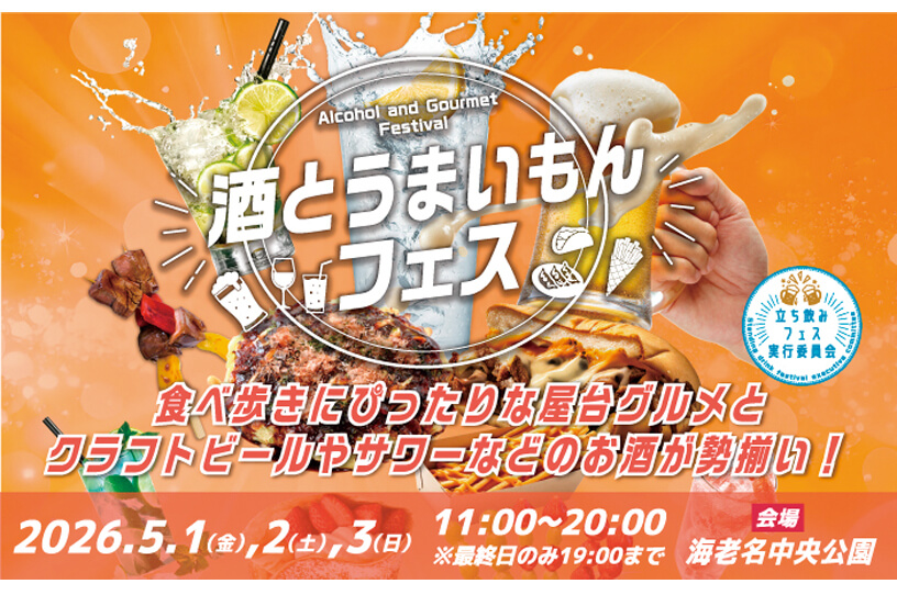 海老名中央公園では、フードフェスティバル「酒とうまいもんフェス」が5月1日(金)から3日(日・祝)までの3日間で開催されます。お酒・フード・縁日の約30店が集合。大阪のたこ焼きや博多の屋台グルメなど、全国の味をお届けします。地元・海老名で創業100年以上の老舗パン屋が手掛ける「Better life withupcycle」のパンのミミを使用したクラフトビールのほか、生絞りサワーなどのお酒もご用意しています。縁日や巨大ふわふわ遊具・大道芸ステージなど、お子さまも楽しめる催しも充実。GWのお出かけにぜひご家族でご来場ください。