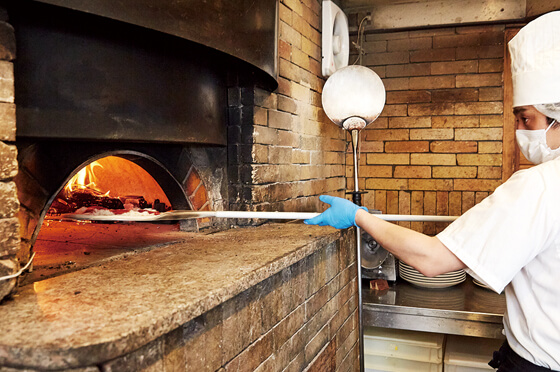 このお店の石窯は、本場のピザを広めたいと、日本で初めてイタリアから輸入されたもの。厳選した食材を使ってこの石窯で焼き上げるピザは絶品です。ピザと並んでパエリアも大人気。キッズスペースもあります。