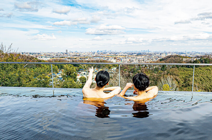 今年3月オープンの天然温泉。自慢は、標高約100mからの眺望を堪能できる3種の絶景露天風呂。昼は緑のパノラマを、夜は都心ビル群の夜景を楽しめます。高濃度炭酸泉など3種の内湯に、サウナ、休息ラウンジ、レストランなども完備。