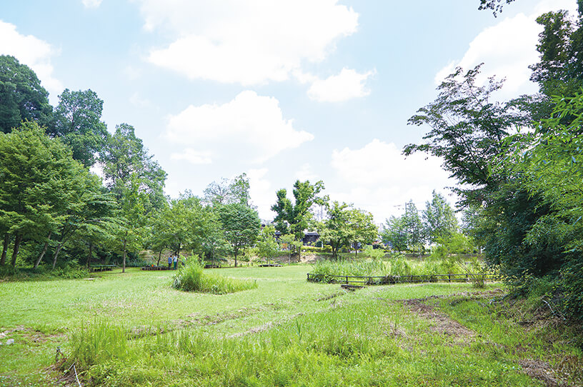 敷地のあちこちから湧水が湧き、さまざまな種類の動植物が生息する緑地。「水辺のある里」のエリアは遊歩道やベンチが整備され、地元有志のボランティアの手によって貴重な自然が守られています。多摩よこやまの道に隣接しています。