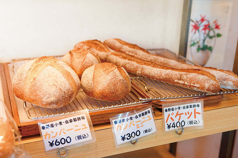 秦野産の小麦や水、地産地消にこだわり、地元の方々に親しまれているパン屋さん。シンプルで飽きのこないバケットやパンドミーをはじめ、ほんのり塩麹が香る塩麹ブレッドやぶどう食パンも人気。