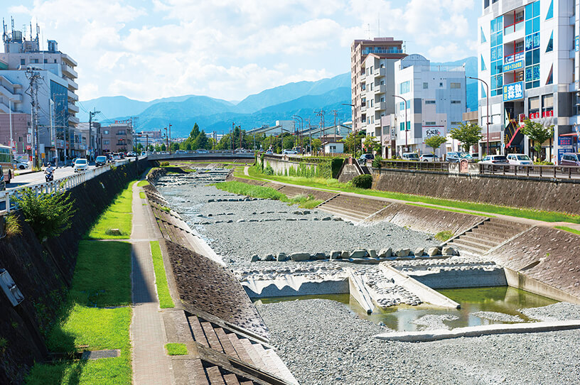 秦野市を東西に流れる水無川。秦野盆地に入ると水が川底に浸透して見えなくなることから、弘法大師が川を干上がらせたという伝説が残っています。
