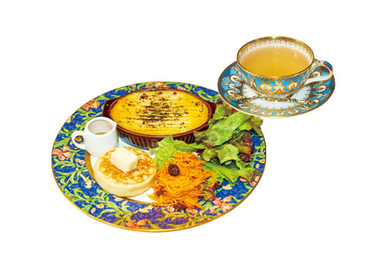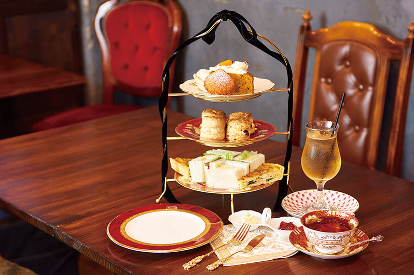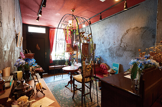 ギャラリー併設のティールーム。英国スタイルを取り入れた店内では、ひき肉にマッシュポテトを乗せたイギリスの家庭料理コテージパイなどがいただけます。100種以上の紅茶が楽しめるアフタヌーンティーはお一人さまもOK。