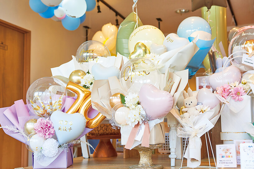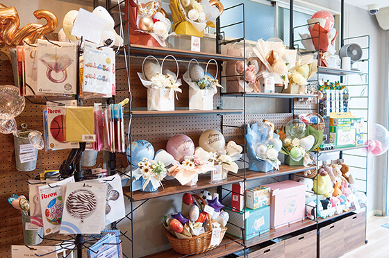記念日を華やかに演出してくれるアイテムがそろうパーティーショップ。シーンに合わせてオーダーできるバルーンギフトや、バースデーにぴったりなお祝いセットなどが人気です。