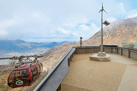 大涌谷駅直結の展望エリア「ちきゅうの谷」には、3つの展望デッキが新設。自然を全身で感じられる展望スペースでは、雄大な自然と触れ合いながら、心地よい開放感を味わえます。駅舎内の「谷のマルシェ」では大涌谷の自然をイメージしたここにしかないスイーツやドリンク、お土産がそろいます。