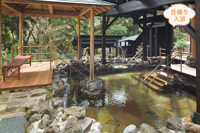 木々に囲まれた自然あふれる立ち寄り湯です。豊富な湯殿とやわらかな泉質に心も体も癒やされます。囲炉裏料理やエステも楽しめます。