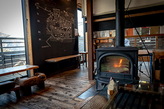 暖炉のあるブックカフェスペースもゆったり過ごせる。