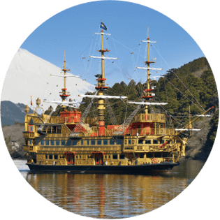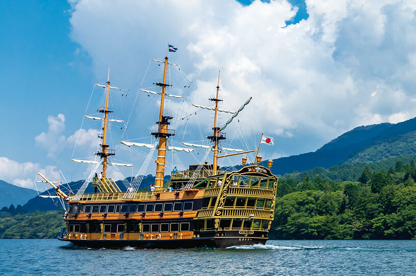 芦ノ湖の自然あふれる景色を楽しみながら、3つの港をめぐる海賊船。間近で見るとその迫力に圧倒されます。ぜひ湖上クルーズを体験してみて