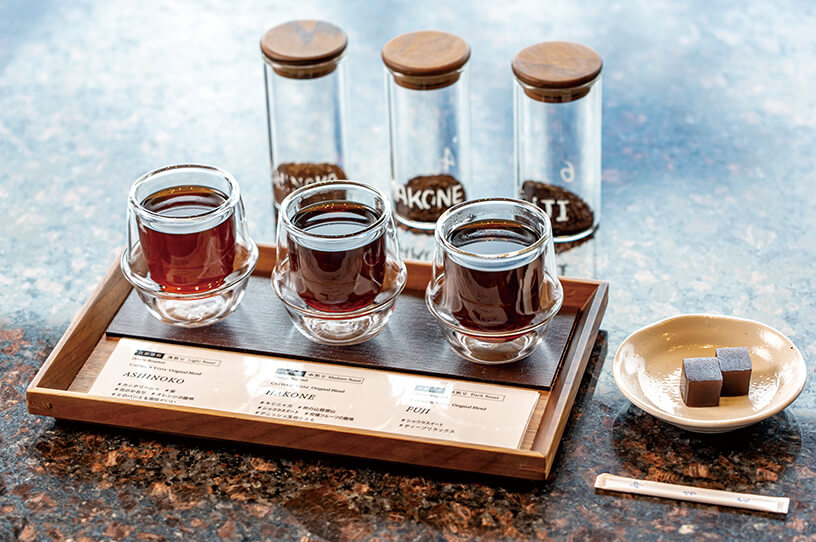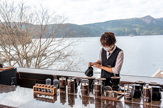 足湯席を備えた湖畔の人気ベーカリーに、コーヒーバーがニューオープン。芦ノ湖が一望できる3階で、自家焙煎豆をじっくりハンドドリップしたコーヒーがいただけます。