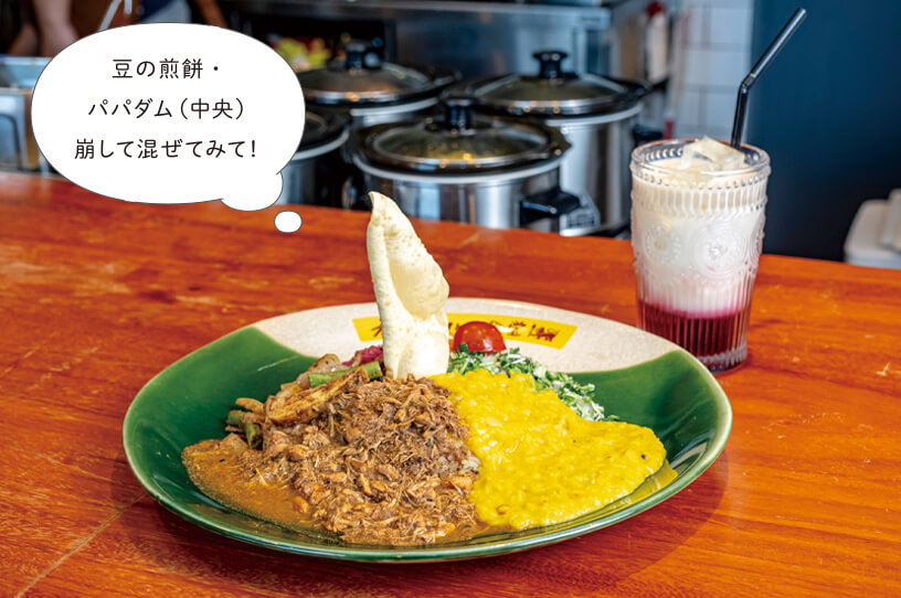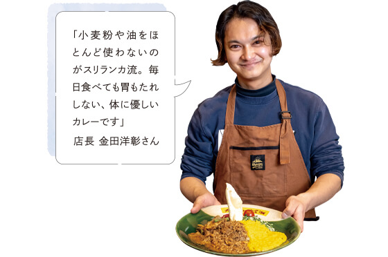 スパイスをふんだんに使ったスリランカカレーの専門店です。徐々に混ぜて食べるとうま味もアップ、本日の気まぐれカレーを含めて6種類が用意されています。