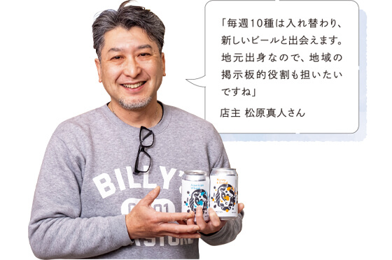 80種以上の国産クラフトビールや、ビアライフを楽しくするアパレルグッズなどをそろえるお店です。奥のカウンターでは生ビールのほかに、缶1本+100円で角打ちも楽しめます。