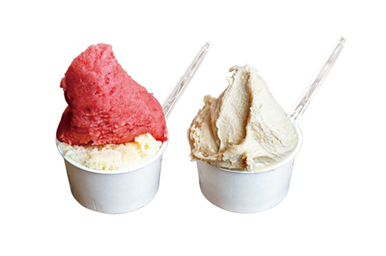 ナチュラルジェラート1カップ600円。左は、あまおう&バニラ、右は、ほうじ茶&レモンチーズケーキ。 -