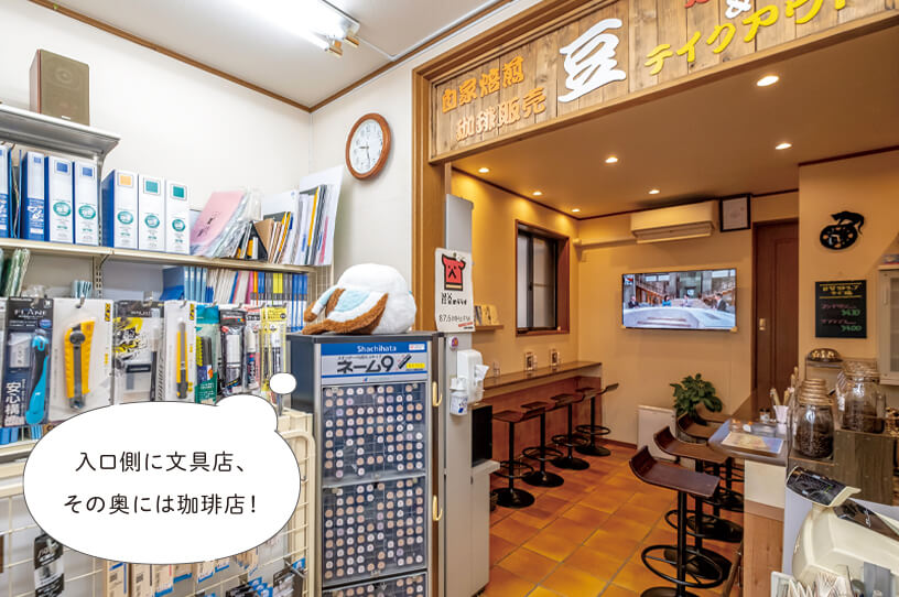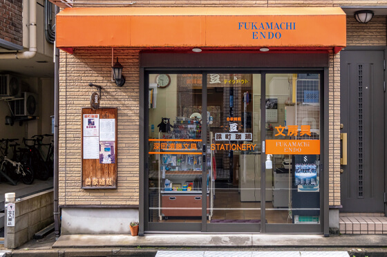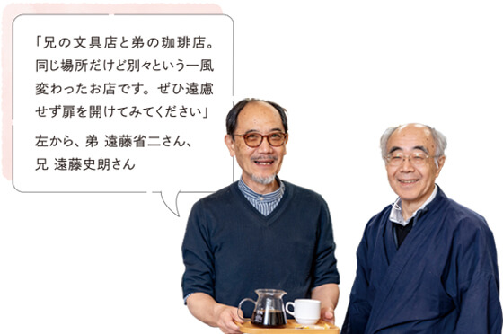 文具店と珈琲店が同居する、ユニークな造りのお店。先代は同地でパン屋を営み、ここで生まれ育った兄弟が、昔の地名「深町」と共に後を引き継ぎ、街を見守り続けています。