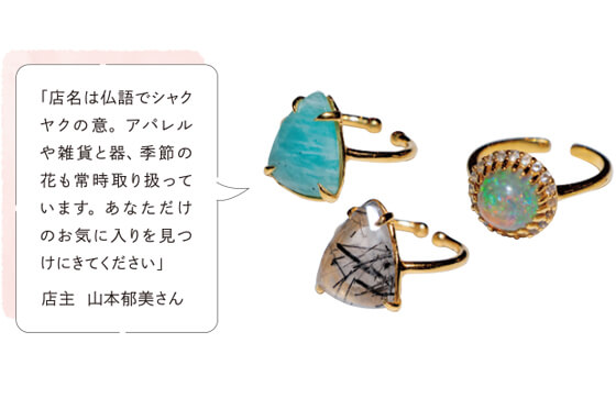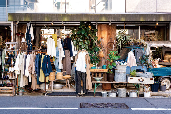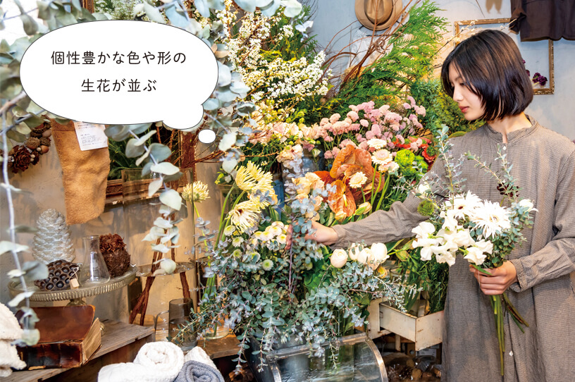 季節の生花を扱うセレクトショップ。店内には天然素材の衣類をはじめ、衣食住を豊かに彩る雑貨などもそろい、ギフト選びにもおすすめです。