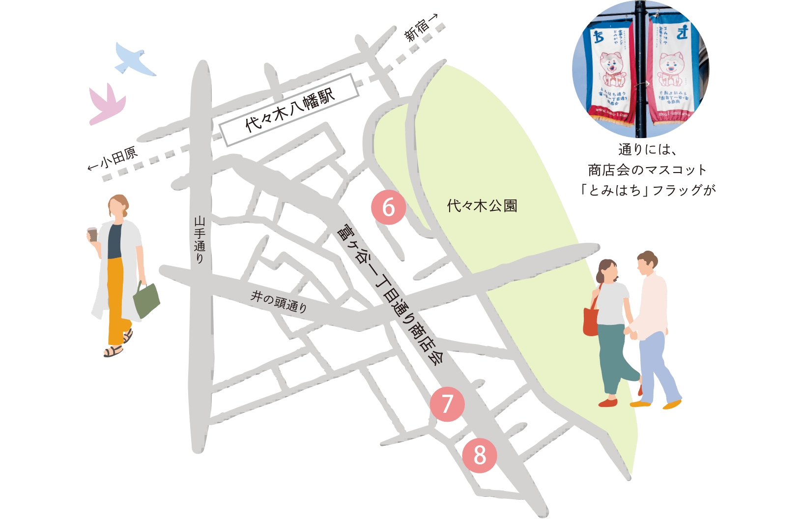 代々木八幡駅から渋谷に通じる、通称とみはち通りにある商店街です。「奥渋」と呼ばれる人気のエリアにあり、地元の方から観光客まで日々多くの人たちでにぎわっています。