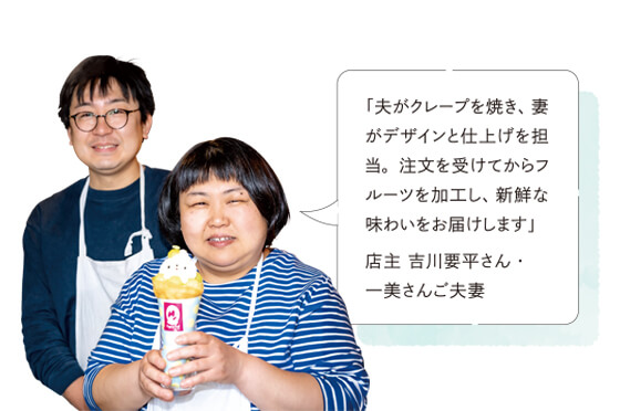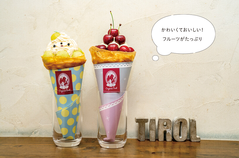 定番だけでも50種類以上あるクレープ専門店。特に季節のフルーツを使った月替わりメニューが人気。クリームやトッピングも選べて、自分だけのバリエーションが広がります。