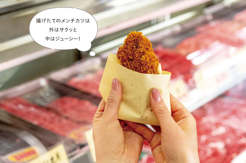 松阪牛にこだわる精肉店。半頭買いしたお肉は鮮度も折り紙付き。そのこま切れ肉をぜいたくに入れたメンチカツをはじめ、揚げ物も大人気です。