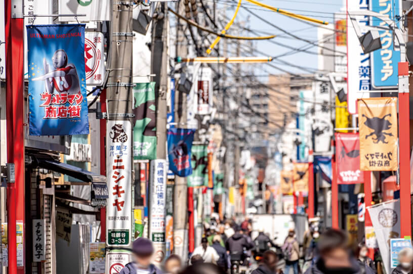 祖師谷から砧に続く3つの商店街の総称「ウルトラマン商店街」。円谷プロ創業の地にちなみ、誕生から21年、今も老舗から若い店主の新店まで、700店以上が軒を連ねます。